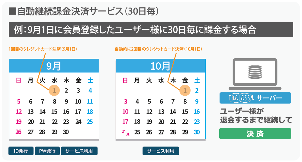 毎月や、毎週など定期的な会員費徴収や継続して同じ金額を決済するような場合にTHALASSA決済システムが自動で処理します。多彩な決済インターバルの設定が可能!毎月だけでなく、隔月や曜日、週単位設定など高度なレンジ設定も可能です。