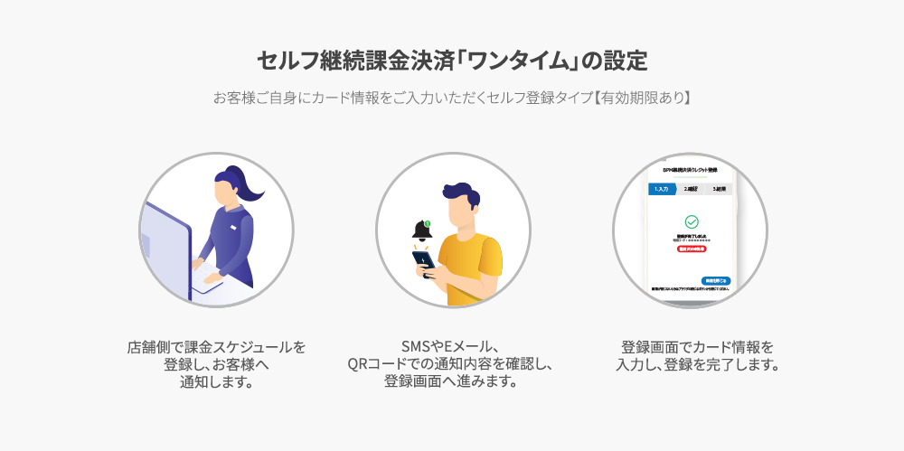 ・ワンタイム型セルフ継続決済では生成したリンクURLをSMSやeメールで送信可能!QRコードも生成することも可能ですので対面でリンクをお渡ししたい場合もスムーズに受け渡しが可能です。